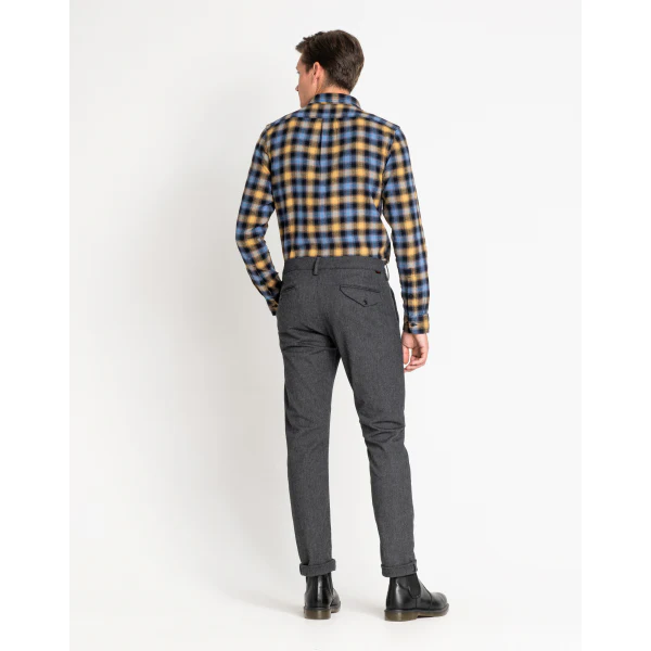 A comfort-stretch melange fabric in the perfect grey. Tonal threads and classic cats-eye buttons. 8 3/4Oz Grey Mele Comfort Stretch